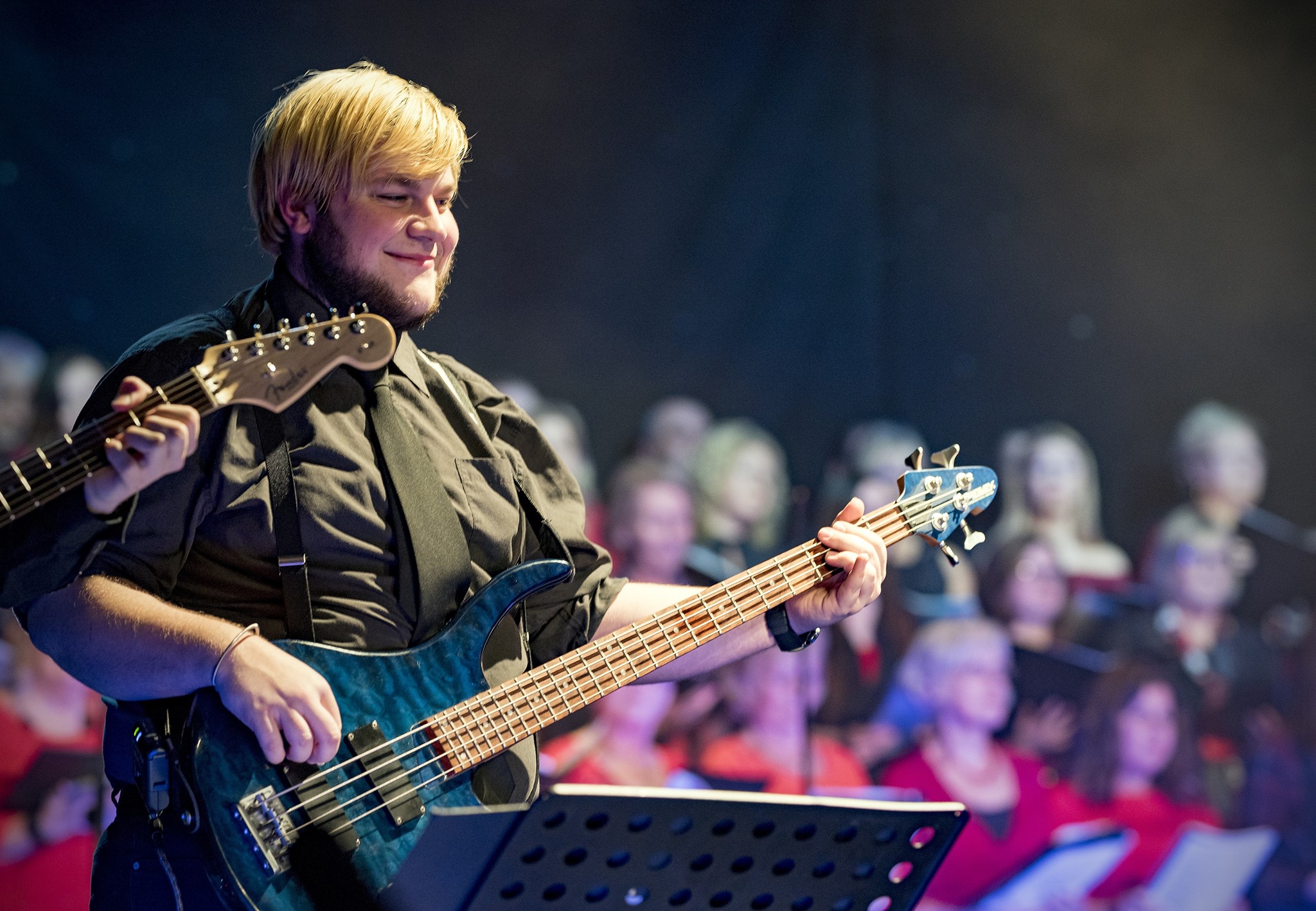With experience under his belt on a wide range of instruments, Ryan focuses nowadays on playing bass for the ReMarkable Theatre Company’s Rock Choirs in Scarborough, Bridlington and Beverley, named ‘ReMarkable Rock’. See more pictures of this below.